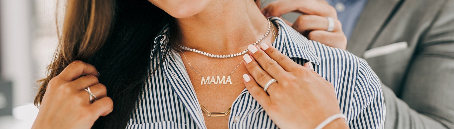 MaterialsGold, Diamond DescriptionUp for sale is a beautiful 14K Gold MAMA Diamond Necklace Round Brilliant Diamond Total weight 0.03 Carats.Color F-G Clarity SI.Specifications:-Model #: DHODMAPEND-Metal Type: White, Yellow, or Rose Gold-Metal Purity: 14K-Chain Length: 16", 18", and 20"-Total Diamond Weight: 0.03 Carats-Color:...