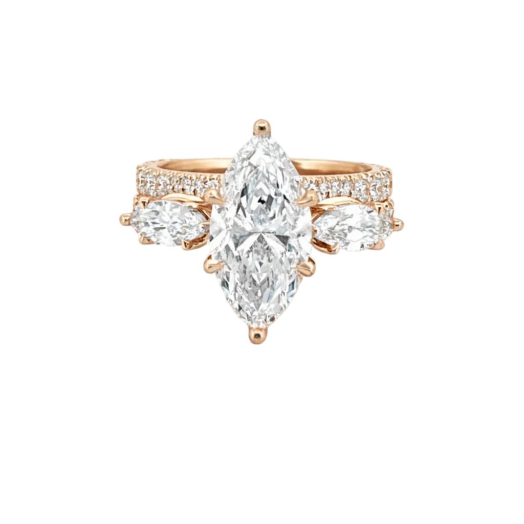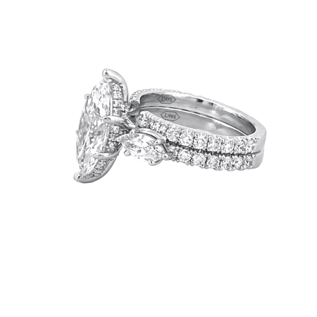 All major stones set with beautiful lab grown marquise cut diamonds and prong set diamonds set half way across both bands!