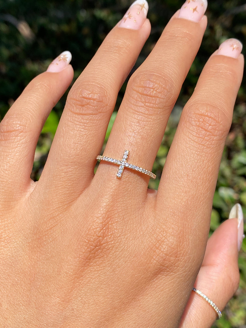 MaterialsGold, Diamond DescriptionUp for sale is a beautiful 14K Gold Diamond Cross Ring. Specifications:-Model #: SJ764WG-Metal Type: Rose, White, and Yellow Gold-Metal Purity: 14K-Band Width: 1MM and 7MM at Length -Gold Weight: 1.3 grams approx. based on ring size-Total Diamond...