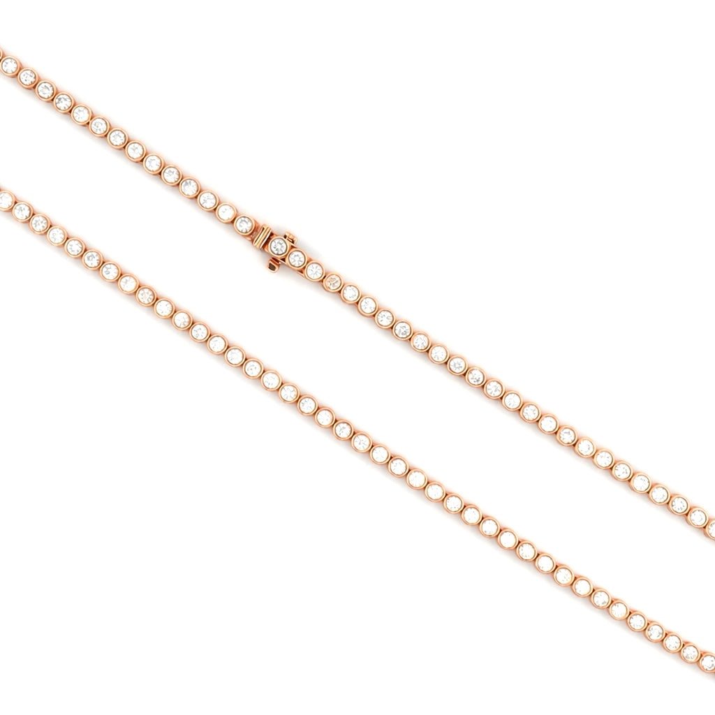 An exquisite round cut lab grown diamond bezel tennis necklace all in 14k gold, crafted in 18".