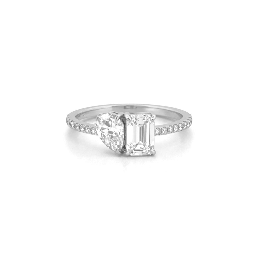 14K Gold 2.00 Carat Lab Grown Prong Set Toi et Moi Pear and Emerald Engagment Ring