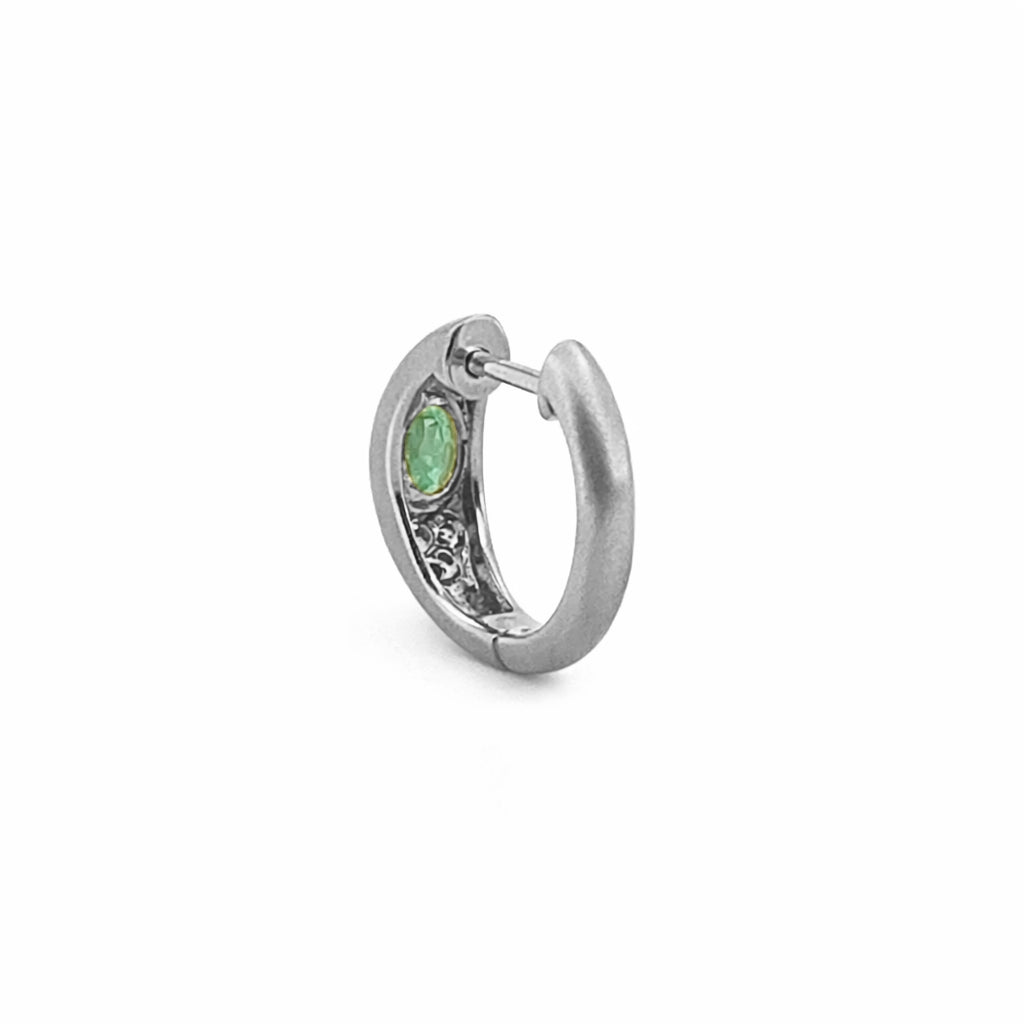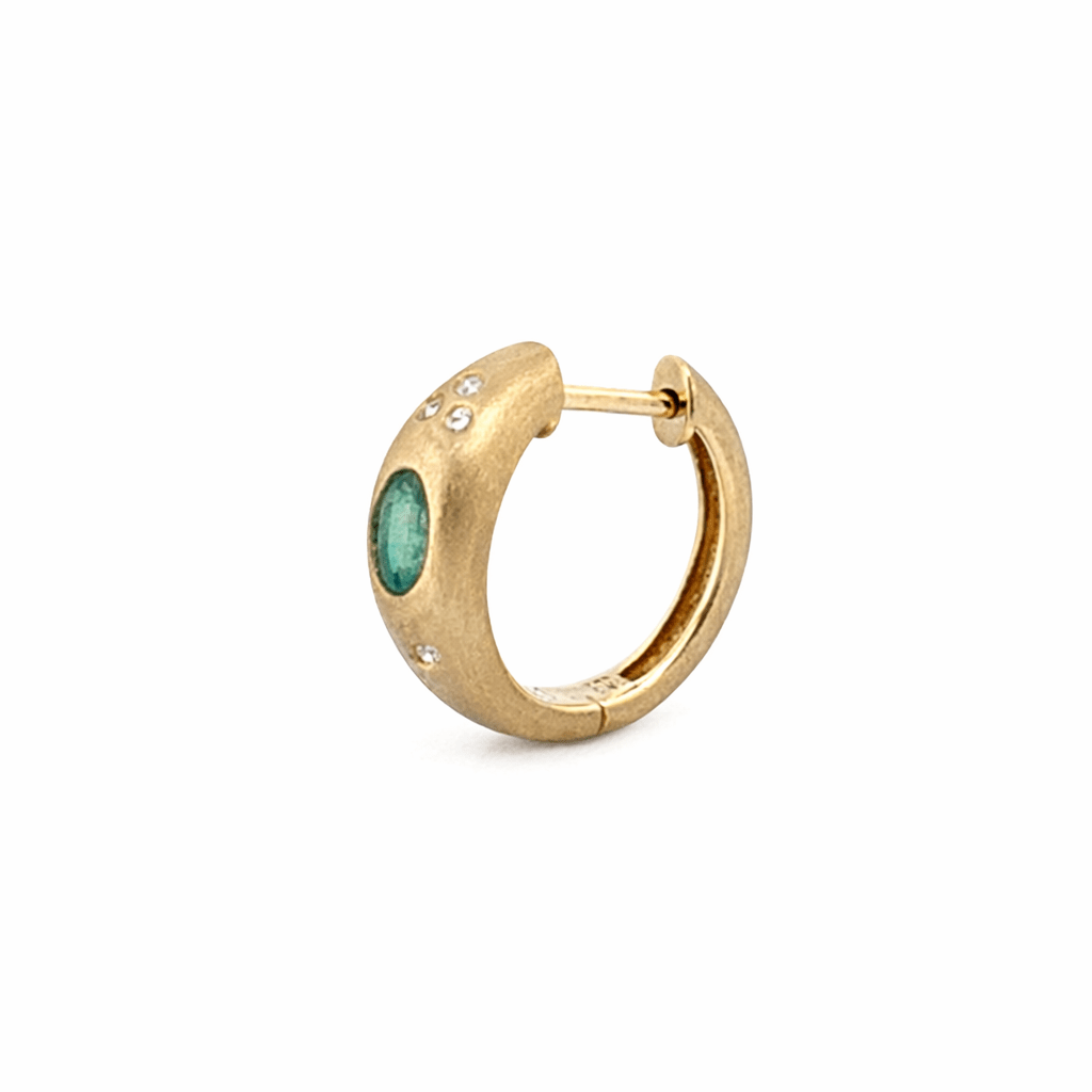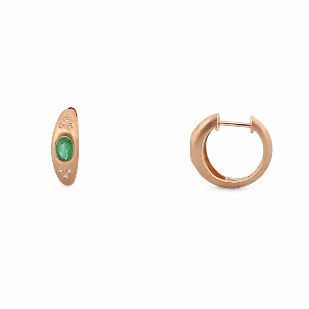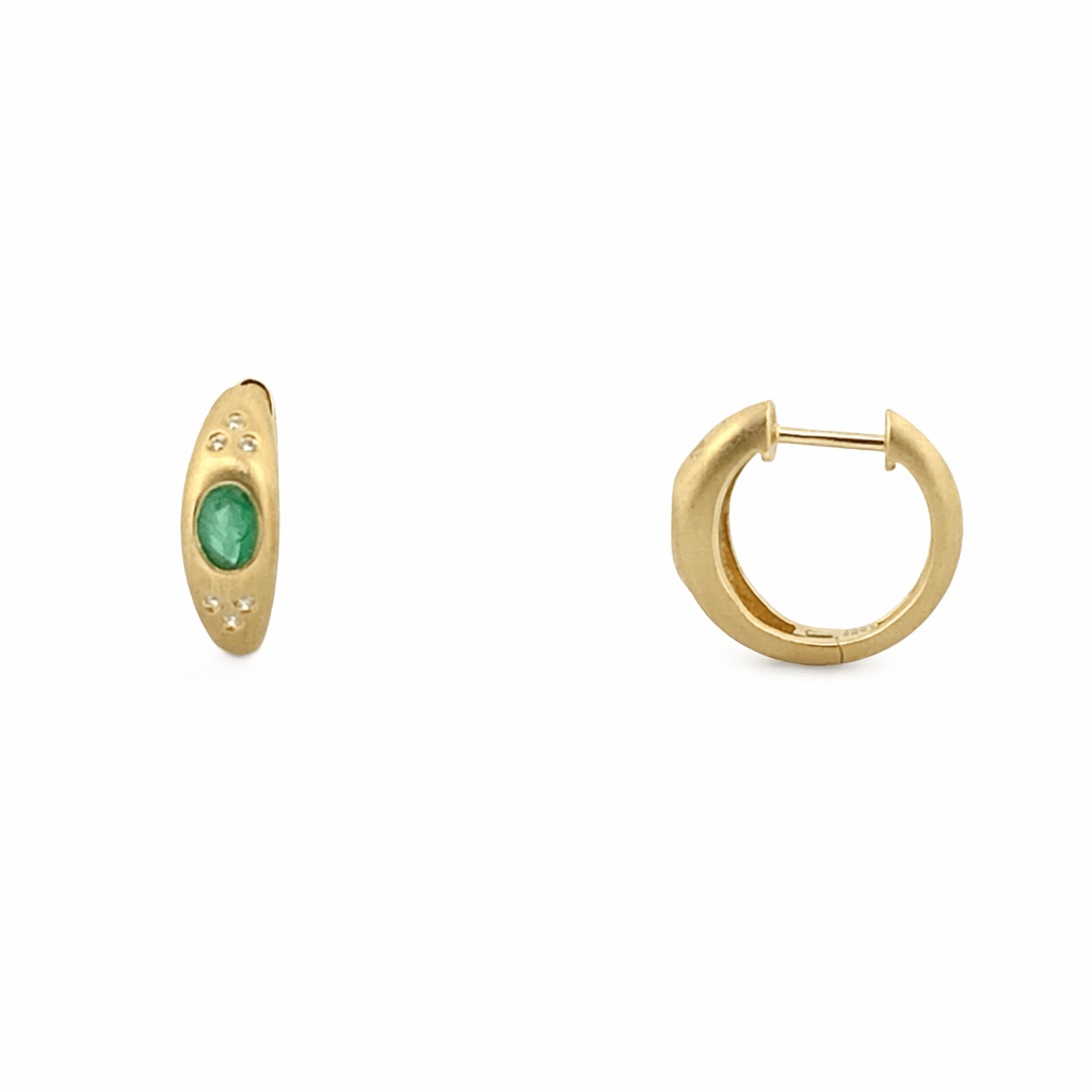 14K Gold Oval Cut Emerald Inset Rounded Diamond Huggie Earrings