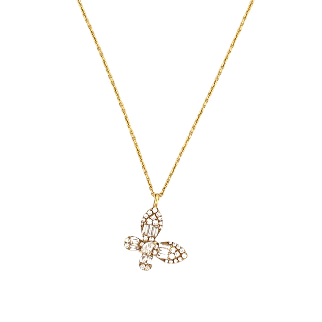 This butterfly necklace is made up of a cluster and variety of stones. These baguettes, rounds, and marquise will shine marvelously across your neck.