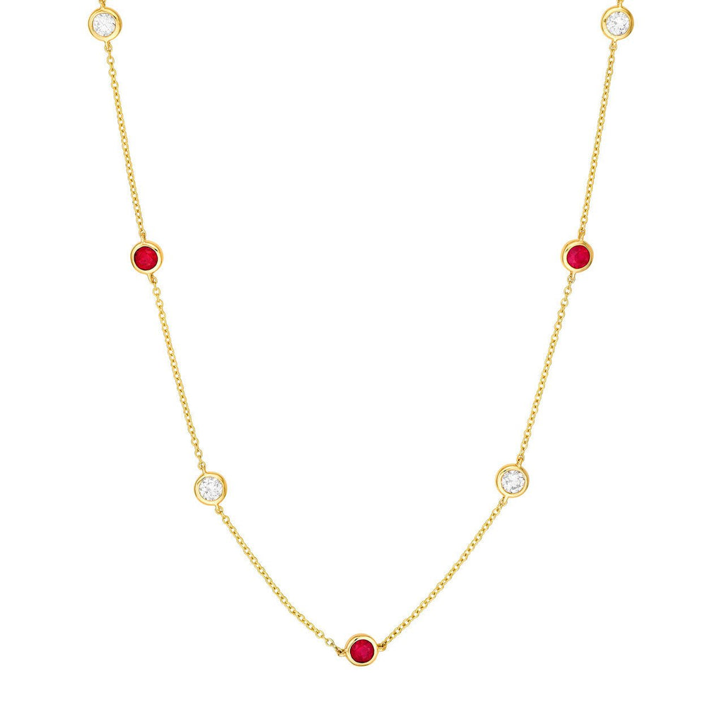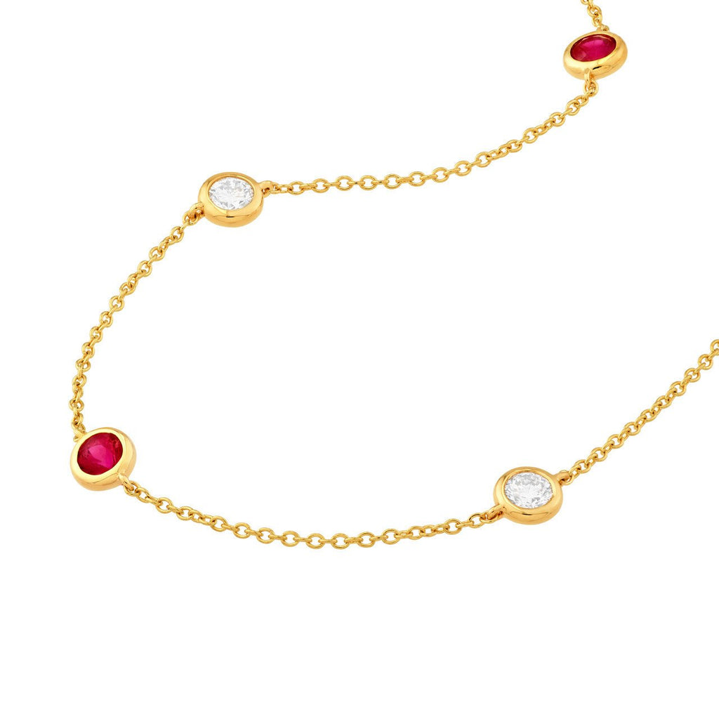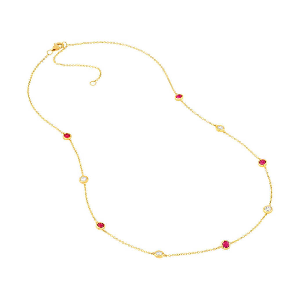 14K Gold Diamond and Ruby Station Bezel Necklace